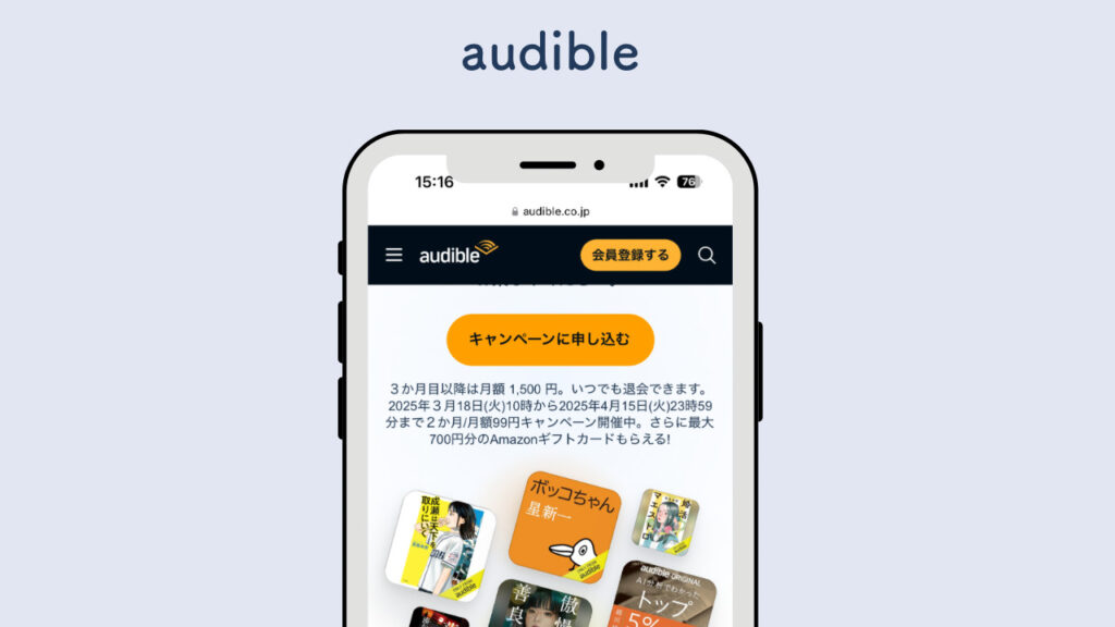 audibleは、最初の2ヶ月間は月額99円とお試し期間が長いのが魅力。2ヶ月後は1500円かかりますが、毎月1冊単行本を聴けば、元を取れる価格帯です。